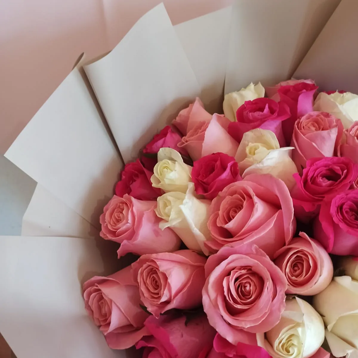✨ Deja que el amor hable con nuestro majestuoso ramo "Solo Tú - Multicolor" 🌹. Un tributo floral de 50 rosas en blanco puro y delicadas tonalidades rosadas que crean un efecto cautivador. Cada petalo seductor y cada tallo elegante han sido cuidadosamente seleccionados para expresar admiración, gratitud o amor profundo.